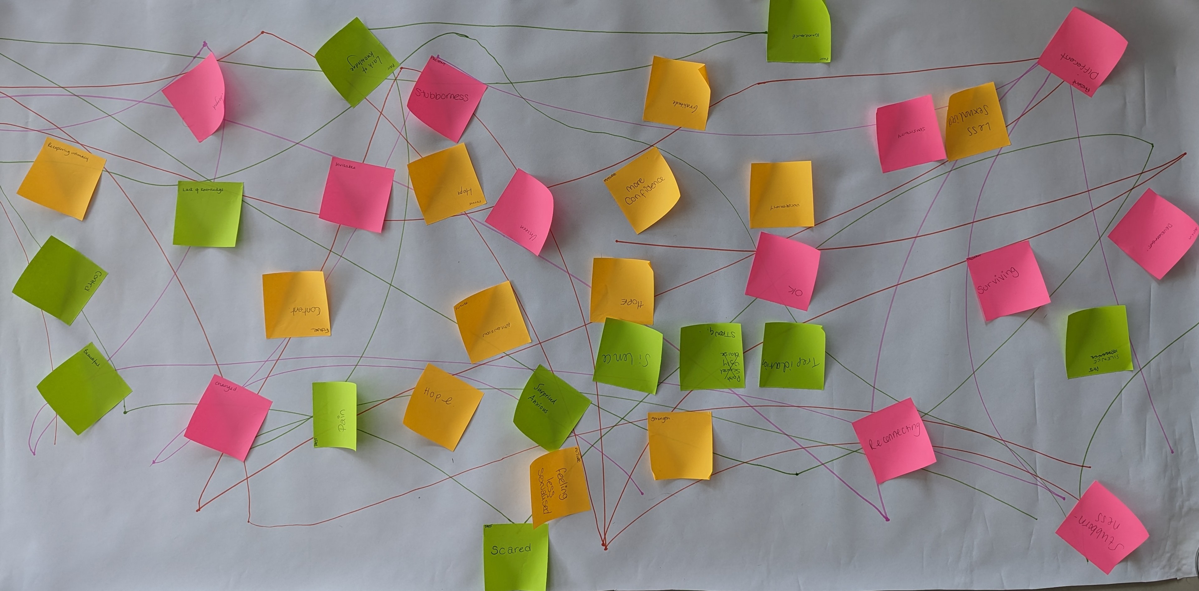 During the exercise, with a particular theme or concept in mind, one person says a word, and draws a line as they say it, passing the pen to somebody else in the group as they do so. When that person receives the pen, they say another word that encapsulates aspects of their experience whilst drawing a line as they pass the pen to another member of the group. Once each person has had the opportunity to take part, group members write a word that resonated with them on a Post-it note, and at the end of the exercise members stick the notes anywhere on the paper covered in lines, perhaps where some lines intersect, or just anywhere that feels right.