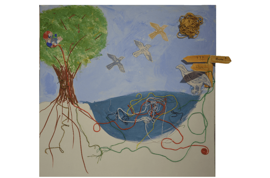 Acrylic Paint on Board, Embroidery Thread, Paper, Card