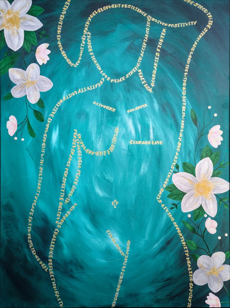When we think of cancer, usually all we think about is how bad, scary, and horrible it is. And it is definitely all of that! But sometimes, there are glimmers of positive things that can come from it. The sense of community from one you never wanted to be part of: the appreciation of more of the little things: even gaining some body positivity. The female shape shown is made up of positive words women have given to describe their cancer journey. The colours were chosen as a way of showing positivity and going back to the earth (green), with the gold taken from Kinstugi art.
