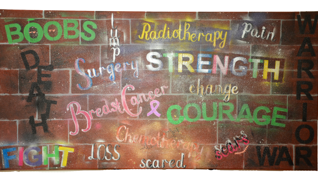 This was inspired by some of the words that commonly come up through cancer treatment. It is a take on street art, just a much smaller format! When going through cancer, sometimes you just want to scream some of these words from a rooftop.