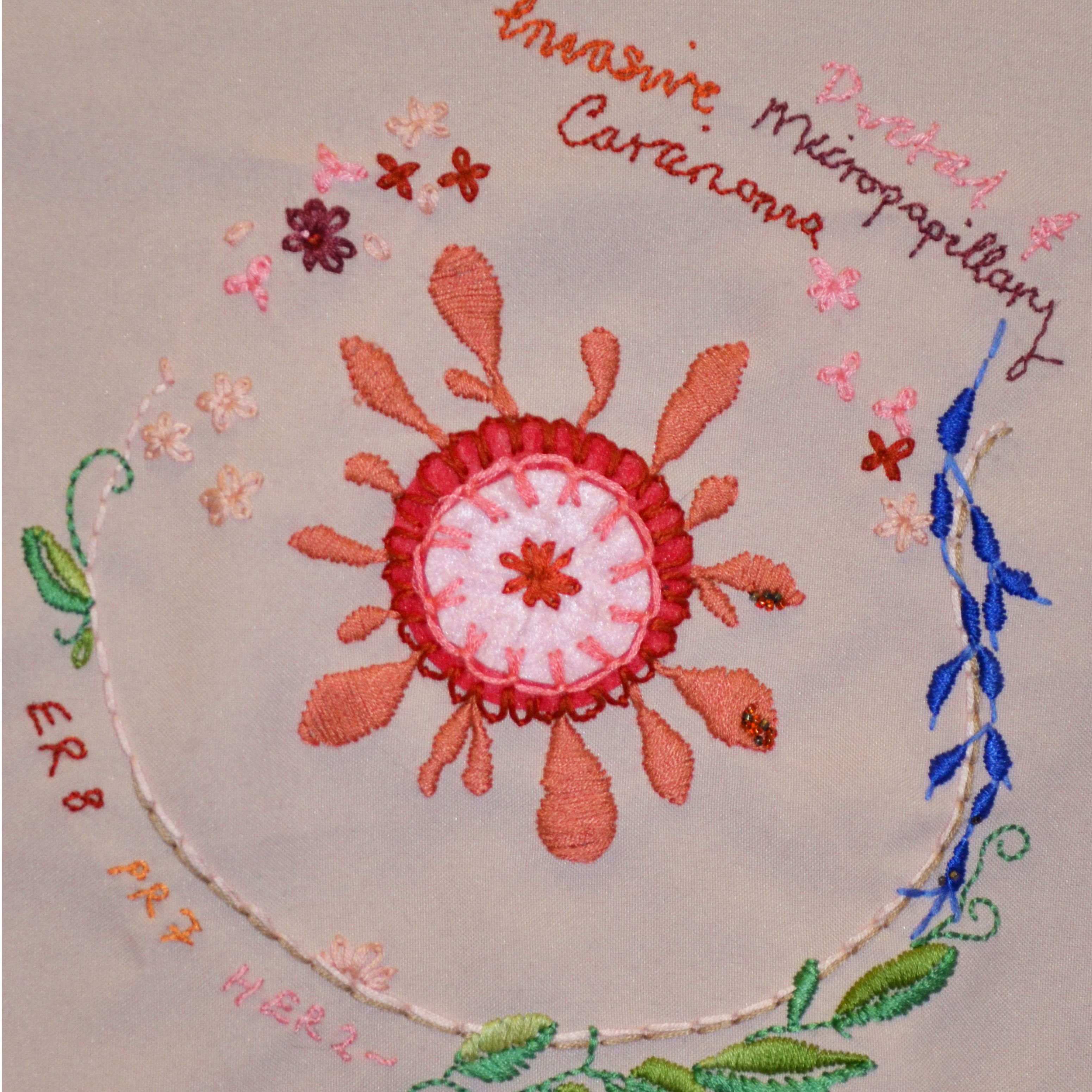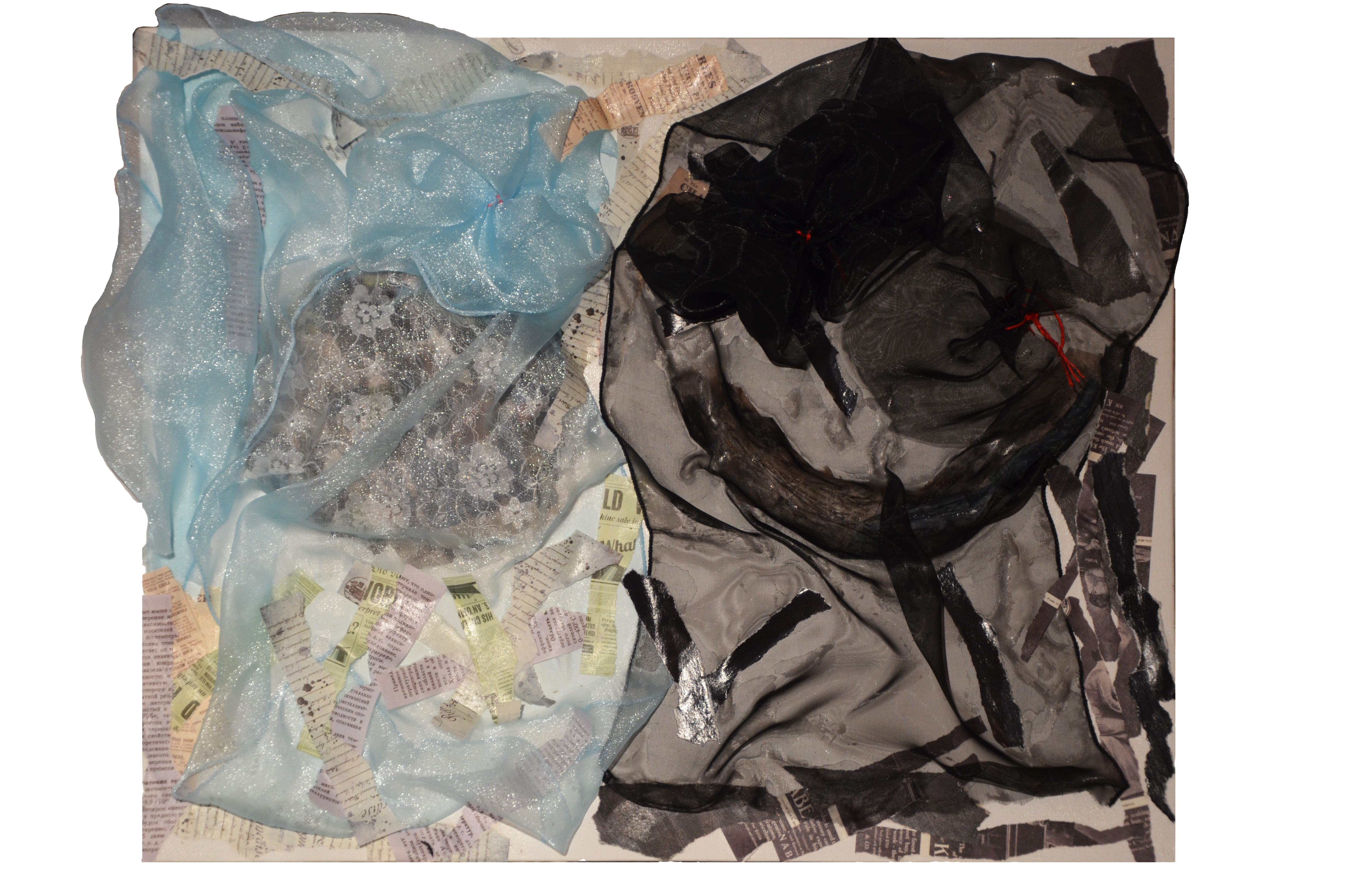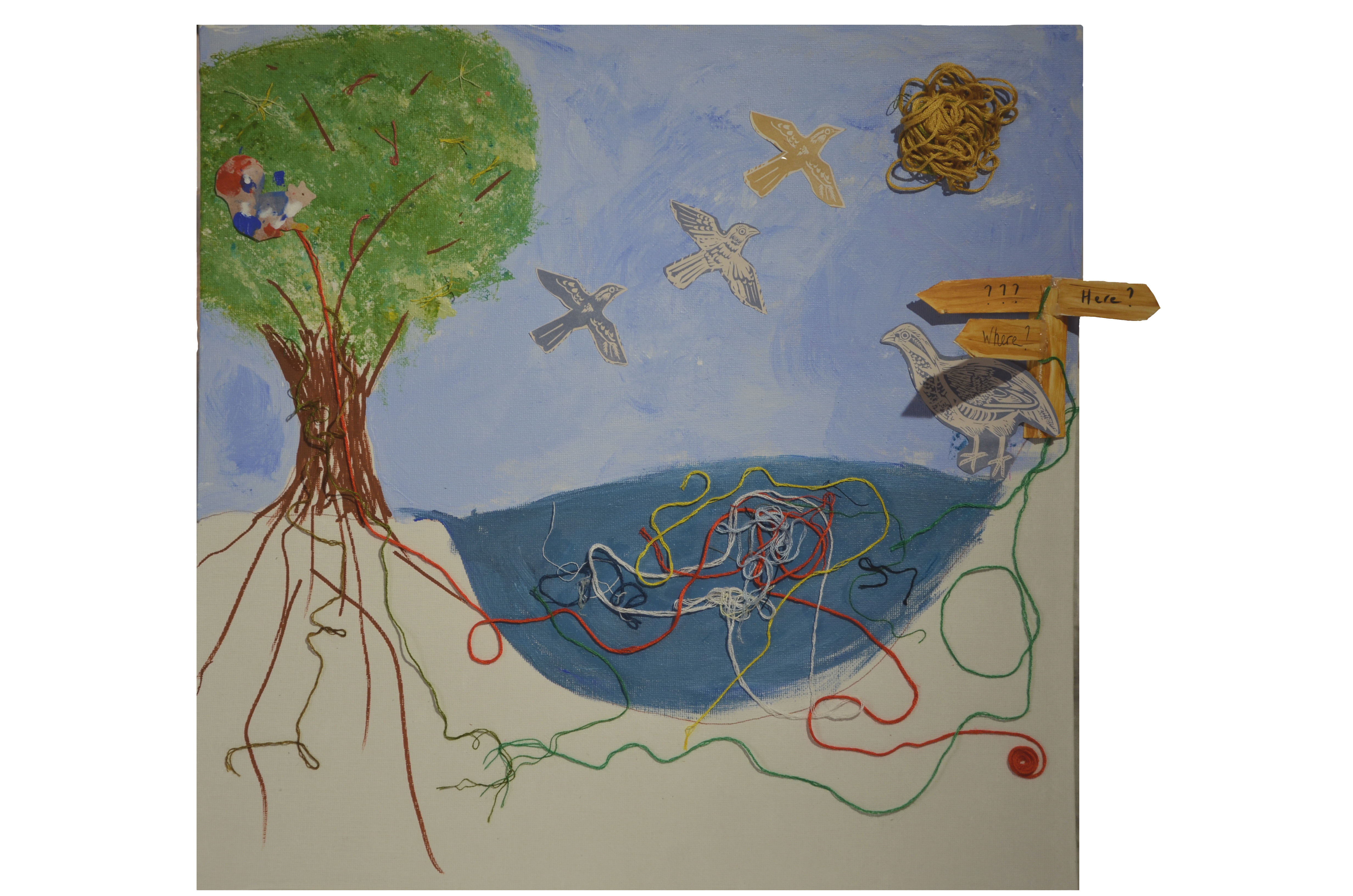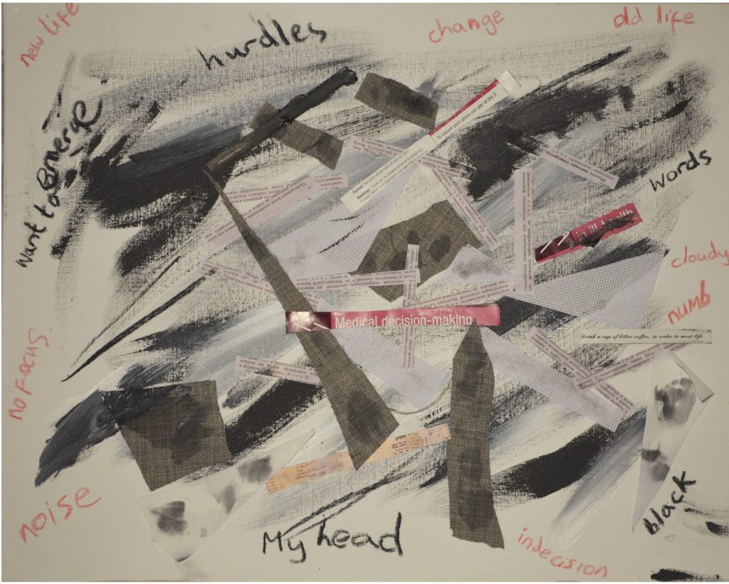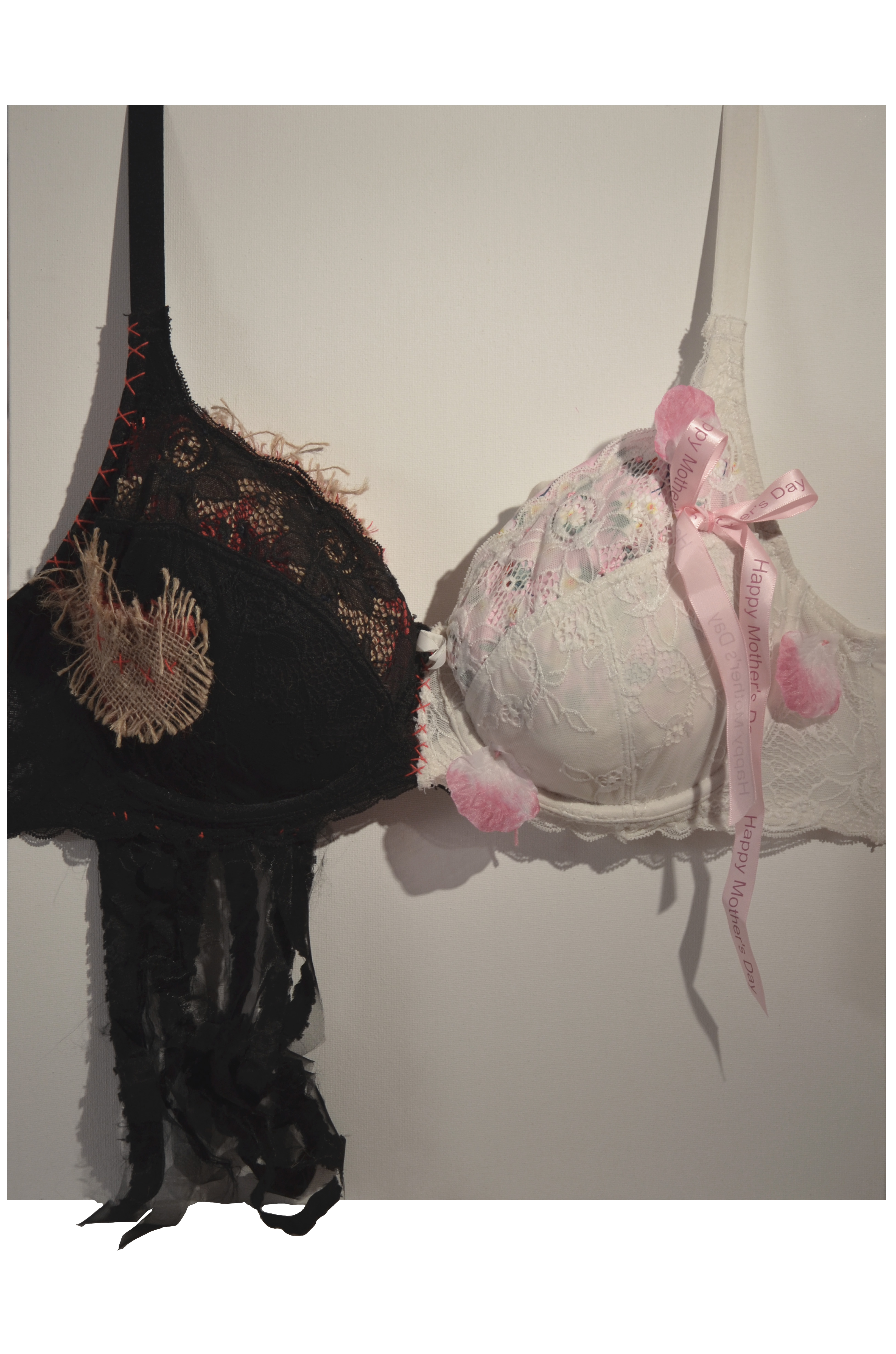 This workshop was an open session, where people could focus on any part of their journey that they did not feel they had explored yet, using any of the materials that were on offer, or that they had brought with them. Some prompts were provided, asking people to consider colours, textures, shapes, images etc. that they associate with their breast cancer surgery journey. Materials provided included canvases, paint, collage materials, embroidery materials, yarn, posca pens, and scrap fabric, among other options. Some co-curators even brought bras with them to embroider onto. Such a large range of materials and techniques accounts for the large range of artistic responses on display here.